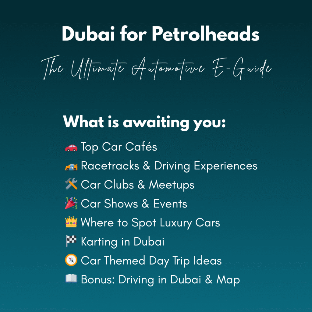This is your key to Dubai’s car culture.From coffee with Ferraris to mountain drives and F1 circuits, this 20-page guide gives you insider access to everything automotive in this stunning city.