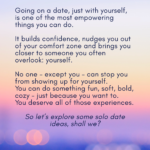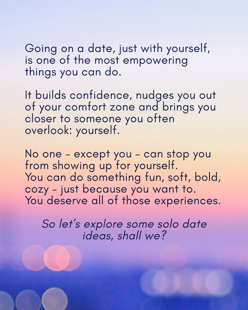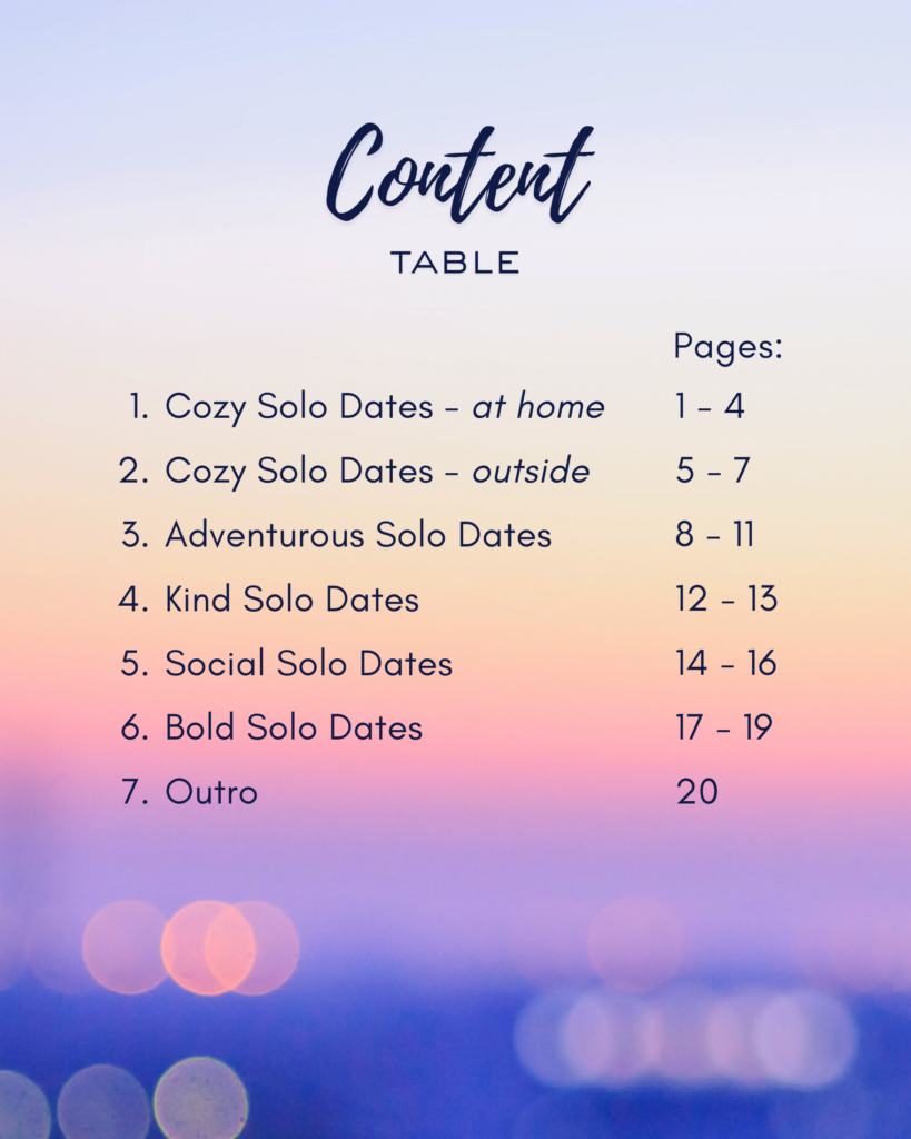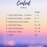 Across 20 pages, you’ll find 36 carefully chosen solo date ideas – some perfect for cozy days at home, some made for adventure, and others designed to bring light not only into your world, but into the lives of others as well.